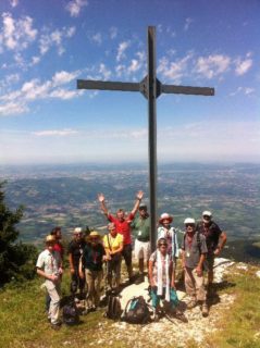 Suite de l’ascension. Tout en haut, le ciel, l’impression d’un vide au-delà de la terre visible. Les Amis profitent quelques instants de la vue puis continuent de longer la crête. Derrière les arbres, un plateau, avec une table d’orientation et une grande croix de fer. Nous sommes à 1 554 mètres d’altitude, au Bec de l’Orient. L’autoroute en contrebas, celle – la même longeant le fleuve de l’Isère et se jetant dans la Seine, ramène à une forme de réalité de laquelle le groupe étions jusque-là coupés. Le temps pour nos randonneurs de faire un point sur la géographie des lieux : « L’Ouest de ce côté » ; « Là-bas on a pique-niqué » ; « Et Voiron ? »