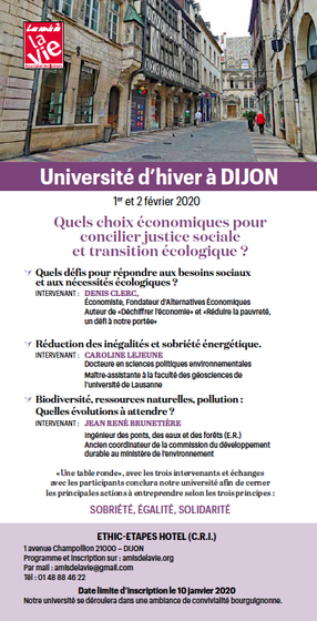 « Penser aux générations futures ? s’exclamait Groucho Marx. D’accord, si vous me citez une seule chose qu’elles aient faite pour moi ! » Les Amis de La Vie ont beau s’attaquer très sérieusement à des sujets sérieux, l’humour n’est jamais bien loin. La dernière université d’hiver, élaborée avec passion, minutie et créativité depuis des mois par le groupe des lecteurs de Côte d’Or, n’a pas fait exception. Celle-ci s’est tenue les 1er et 2 février à Dijon sur le thème : « Quels choix économiques pour concilier justice sociale et transition écologique ? ».